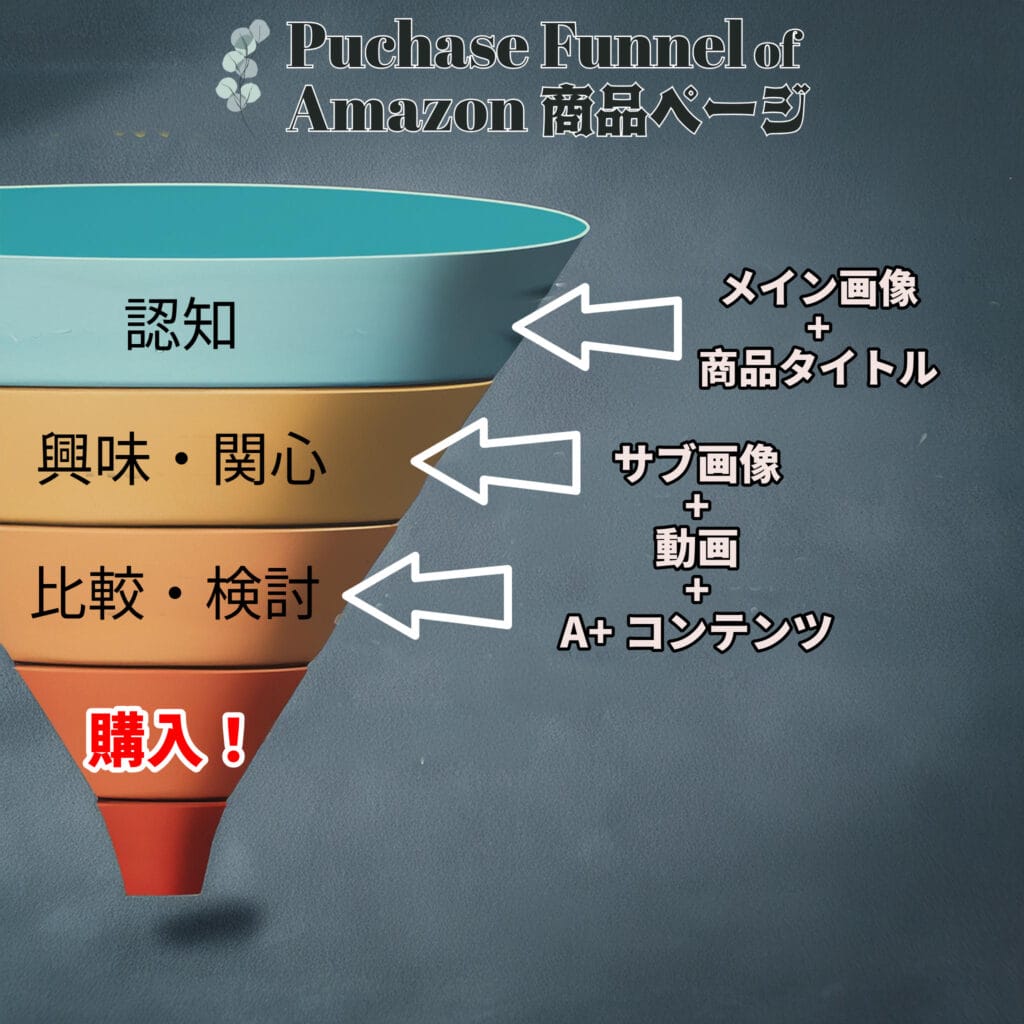 このファネルの考え方をAmazonでの購入のケースにあてはめ、各段階で商品ページのどの要素が機能するかを解説します。